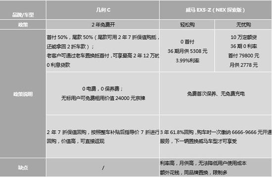 仅仅从政策本身去看几何C的优惠力度恐怕还不够,通过与竞品车型相应金融政策对比能更加直观看出优势。最近,威马EX5-Z推出了一元购车享千元豪礼的优惠政策,车主支付1元可得到5000元购车抵用券,此外还能获得新车免费首次保养、电池质保等多项权益。威马提供的购车金融服务,最优惠的方案为轻松购与无忧购。以售价179800元的NEX探索版为例,限时使用的轻松购方案虽是0首付,但其利率高达3.99%,后期月供还需36期内还完。而无忧购方案,首付则需要79800元,虽为0利率但是36期月供每期高达2778元。