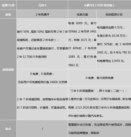 相比威马,小鹏G3的金融政策相对多元,除了终身免费充电服务、新车免费首次保养,在近期还推出了电池租赁计划。以小鹏G3的520i悦享版为例,该车电池价格为6万元,使用电池租赁方式购买后,车主每月还需支付除车身之外近千元的电池租赁费用。如果选择首付50%,不想以用电池租赁方式而想购买整车的车主,前三年电池+车身的月供则为2401元,后四年还需继续支付月供780元电池费用,这样仅利息费就达到上万元。即使用车成本相对较低、还有6000元贴息的低息方案,性价比仍不及几何高。